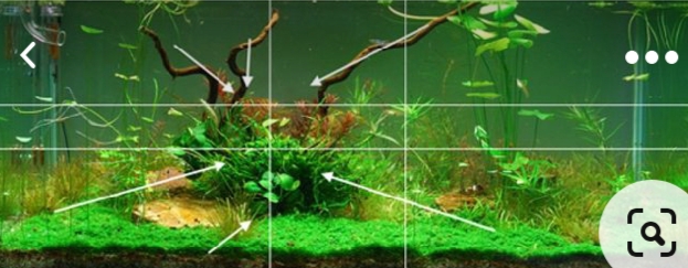 Tỷ lệ vàng. Những hồ thủy sinh đẹp luôn đi theo tỷ lệ này. Để đơn giản hóa vấn đề, ta chia chiều dài hồ thành 3 phần ước lệ, hãy sắp xếp điểm nhấn của bố cục vào ranh giới giữa phần 1 và phần 2 hoặc ranh giới phần 2 và phần 3. Đó là tỷ lệ vàng, là điểm vàng của hồ thủy sinh.